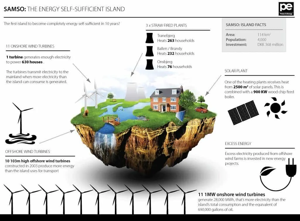 De omschakeling begon met de installatie van windturbines—11 op land en 10 offshore—die samen meer elektriciteit opwekken dan het eiland verbruikt. Daarnaast werden dorpsverwarmingssystemen geïmplementeerd die gebruikmaken van lokale biomassa, zoals stro en houtsnippers, en zonne-energie. Huishoudens die verder van de dorpskernen wonen, stapten over op warmtepompen. Deze gecombineerde aanpak resulteerde erin dat Samsø sinds 2002 meer energie produceert dan het verbruikt, waardoor het zichzelf CO₂-neutraal mag noemen.
